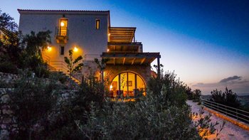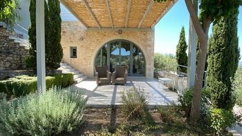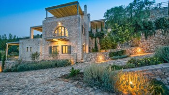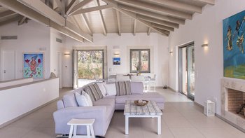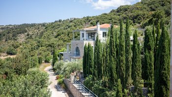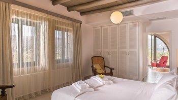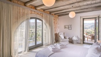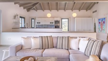 Dieses dreistöckige Haus ist eine moderne Version der klassischen griechischen Villa und liegt auf einem Hügel mit Blick auf das Dorf Gavalochori, das 10 Minuten zu Fuß entfernt ist. Mit Terrassen auf jeder Ebene mit friedlichen Panoramen, über zeitlose Olivenhaine bis hin zum Blau der dahinter liegenden Bucht, nutzt die Villa Levanda die traditionelle Inselarchitektur und passt sie dann an das Leben des 21. Jahrhunderts an. So gibt es Wände aus Sichtstein und riesige Bogenfenster, die eine fantastische Aussicht einrahmen, aber jetzt fügen sie sich wunderbar mit einem sehr schicken Dekor in frischem Weiß, sanfter Taupe und silbrigen Grautönen ein.