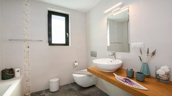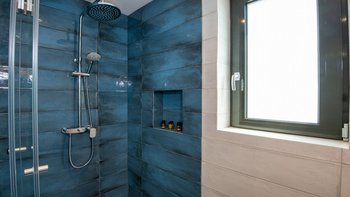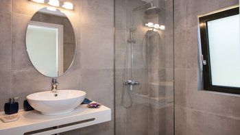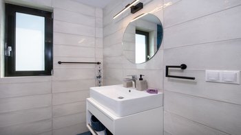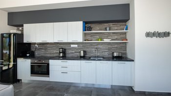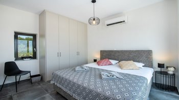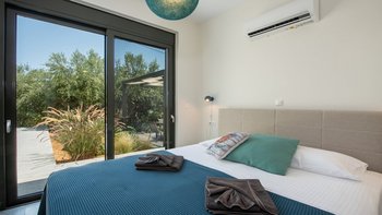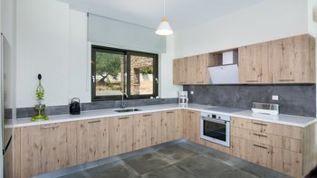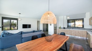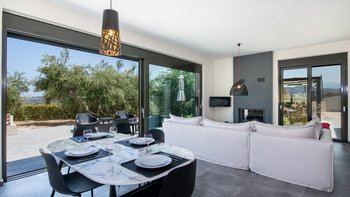 Die Innenräume der Villa sind eine nahtlose Mischung aus modernem Design und natürlichen Materialien und schaffen ein Ambiente, das sowohl stilvoll und auch einladend ist. Der OFFENER GRUNDRISS Wohnbereich im Haupthaus ist dank der großen Glastüren, die den Innenbereich mit dem Außenbereich verbinden, in natürliches Licht getaucht. Bequeme Sitzbereiche laden zum Entspannen ein, während die voll ausgestattete Küche mit modernen Geräten und eleganten Arbeitsplatten der Traum eines Kochs ist. Ein geräumiger Essbereich bietet den perfekten Rahmen, um Mahlzeiten mit Blick auf den Olivenhain zu teilen.