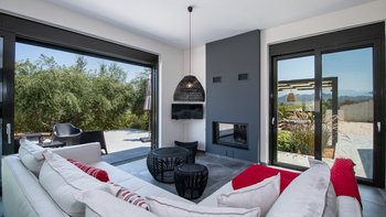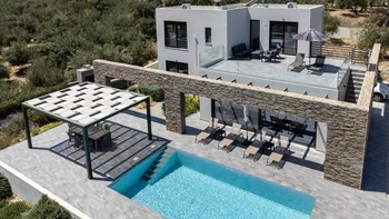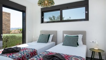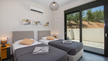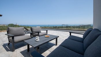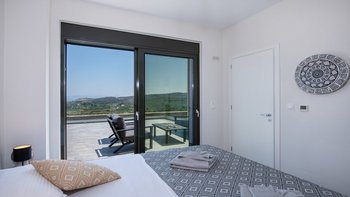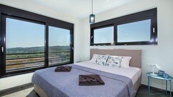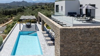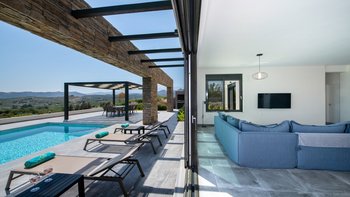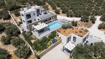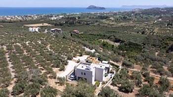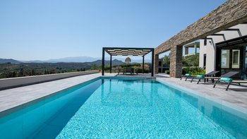 Die Villa Lumina ist ein moderner Rückzugsort in einem 7.000 m² großen Olivenhain mit privatem Pool und bietet einen atemberaubenden Blick auf die Bucht von Chania und die Weißen Berge.