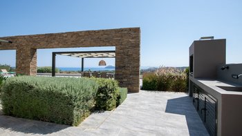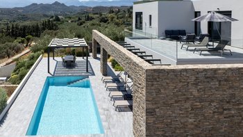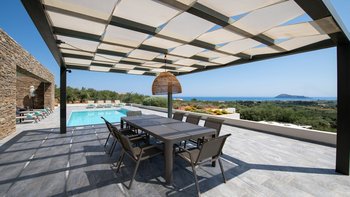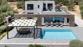 Treten Sie hinaus in das weitläufige Outdoor-Paradies, wo die Schönheit der Landschaft Kretas im Mittelpunkt steht. Der private Swimmingpool der Villa ist das Highlight des Außenbereichs. Um den Pool herum befinden sich bequeme Sonnenliegen, in denen Sie die mediterranen Strahlen genießen können, und schattige Sitzbereiche, in denen die Gäste entspannen können.