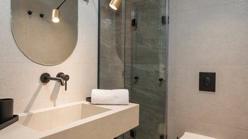 • Zweibett-Schlafzimmer (kann als Kingsize-Bett zusammengestellt werden) mit Dusche en suite mit Zugang zur Terrasse