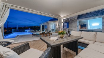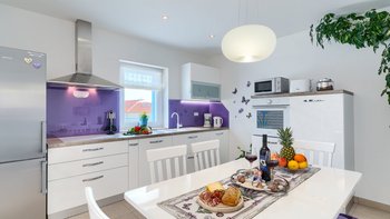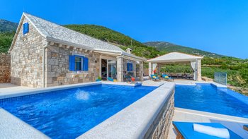 Freunde und Familien werden die Villa Lillie lieben, ein wunderschönes Steinhaus mit atemberaubendem Blick auf die Küste. Deren Innere der Villa ist hell und sauber, in neutralen Farbtönen gehalten und mit schönen lilafarbenen Möbeln versehen. Der offene Wohnbereich verfügt über einen komfortablen Sitzbereich mit Fernseher und Möglichkeit zum Essen im Innenbereich, während Schiebetüren auf die Terrasse mit einem zweiten Esstisch öffnen, falls die Gäste ihre Mahlzeiten lieber im Freien genießen möchten. Eine speziell gebaute Pergola bietet an sonnigen Tagen willkommenen Schatten und ist mit komfortablen Rattansitzen neben einer Außenküche und einem Grill und Grill ausgestattet. Ein beheizter Pool mit freiem Meerblick neben einem eigenen Kinderbecken und einem kleinen Kinderspielplatz befindet sich im Garten.