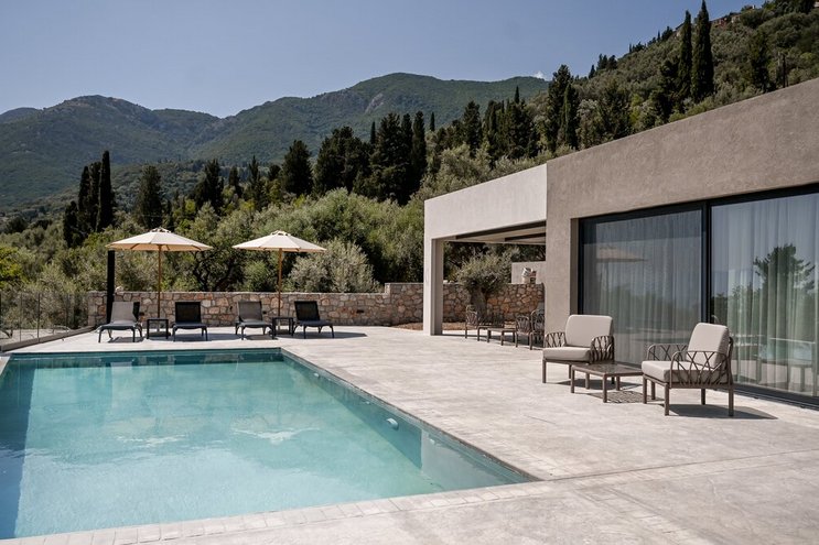 Innen und außen wunderschön gestaltet, ist diese moderne Villa mit atemberaubendem Blick über die Inseln Skorpios nur 450 m von einem hübschen Kiesstrand entfernt.