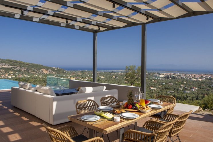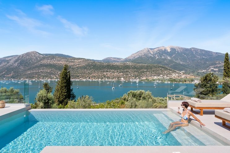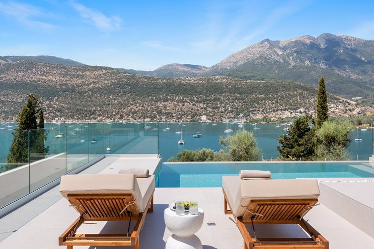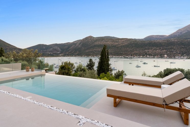 Eine geräumige Villa mit vier Schlafzimmern und großen Terrassen, von denen aus Sie den atemberaubenden Blick über das glitzernde Wasser des Ionischen Meeres genießen können, übersät mit üppigen grünen Inseln und Segelbooten.