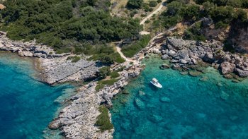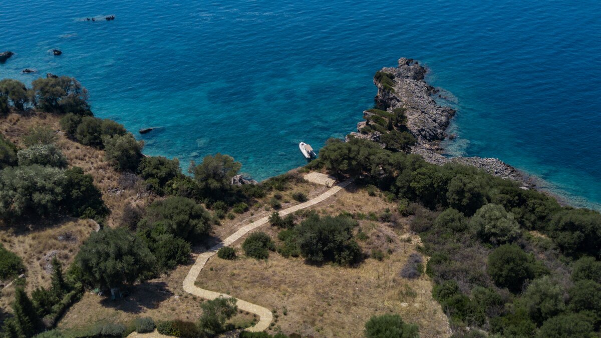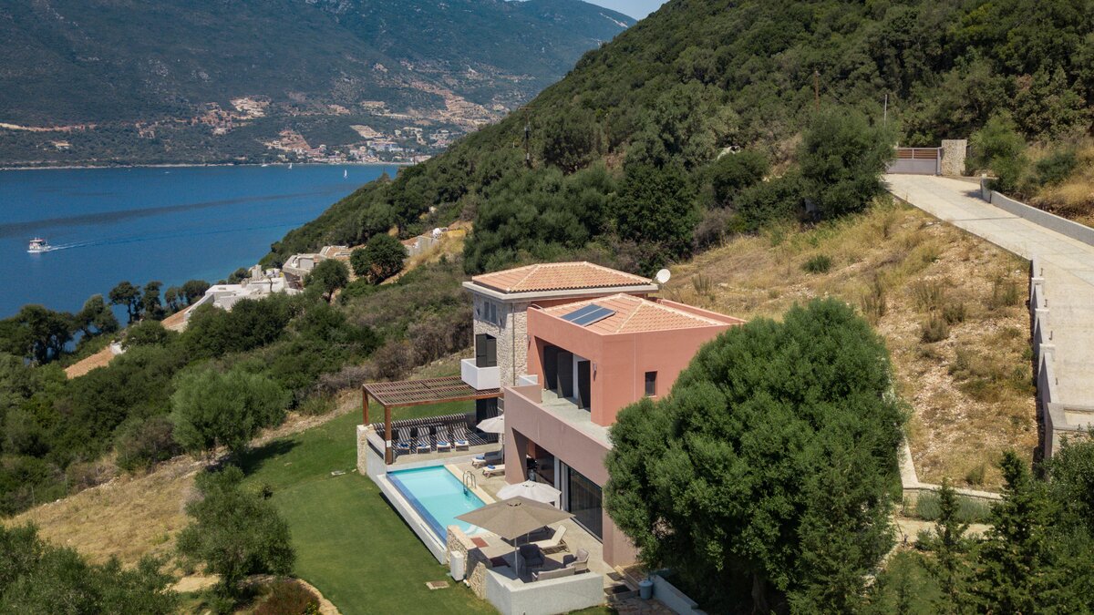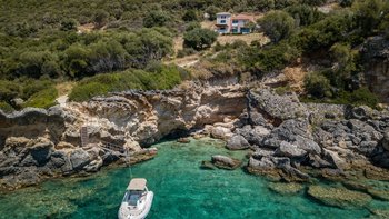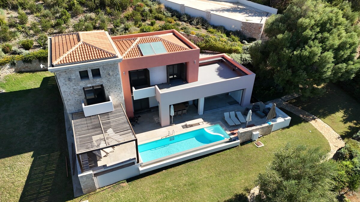 Der Azure Point befindet sich in einer wirklich atemberaubenden Lage direkt am Wasser und bietet einen ununterbrochenen Blick auf das Meer und einen Pfad, der zu einem Felsvorsprung führt, der in das glitzernde Ionische Meer ragt. Deren Außenbereich ist sorgfältig gestaltet, um das Beste aus der unglaublichen Aussicht zu machen, mit einem privaten Infinity-Pool, der in eine Terrasse versenkt ist, die mit großen Liegestühlen und weichen Sitzgelegenheiten ausgestattet ist. Deren Haus selbst ist so gestaltet, dass die Grenzen zwischen Innen- und Außenleben verwischt werden, mit Glasschiebetüren in der modernen, gut ausgestatteten Küche, die sich komplett zur Terrasse öffnet, um ein Gefühl im Freien zu schaffen. Von der Küche aus führen einige Stufen in das OFFENER GRUNDRISS Wohn- / Esszimmer, ebenfalls mit Schiebetüren, die zur Terrasse führen und den Raum mit Licht durchfluten.