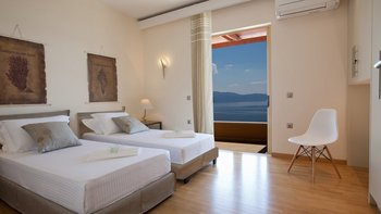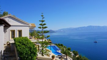 Eine geräumige Villa mit vier Schlafzimmern und großen Terrassen, von denen aus Sie den atemberaubenden Blick über das glitzernde Wasser des Ionischen Meeres genießen können, übersät mit üppigen grünen Inseln und Segelbooten.