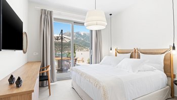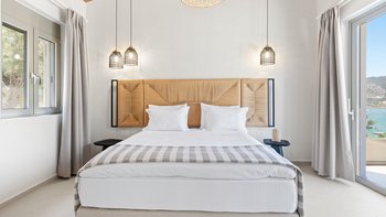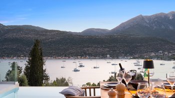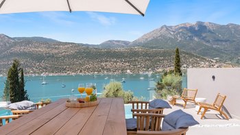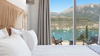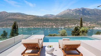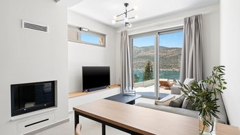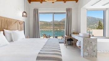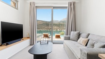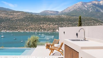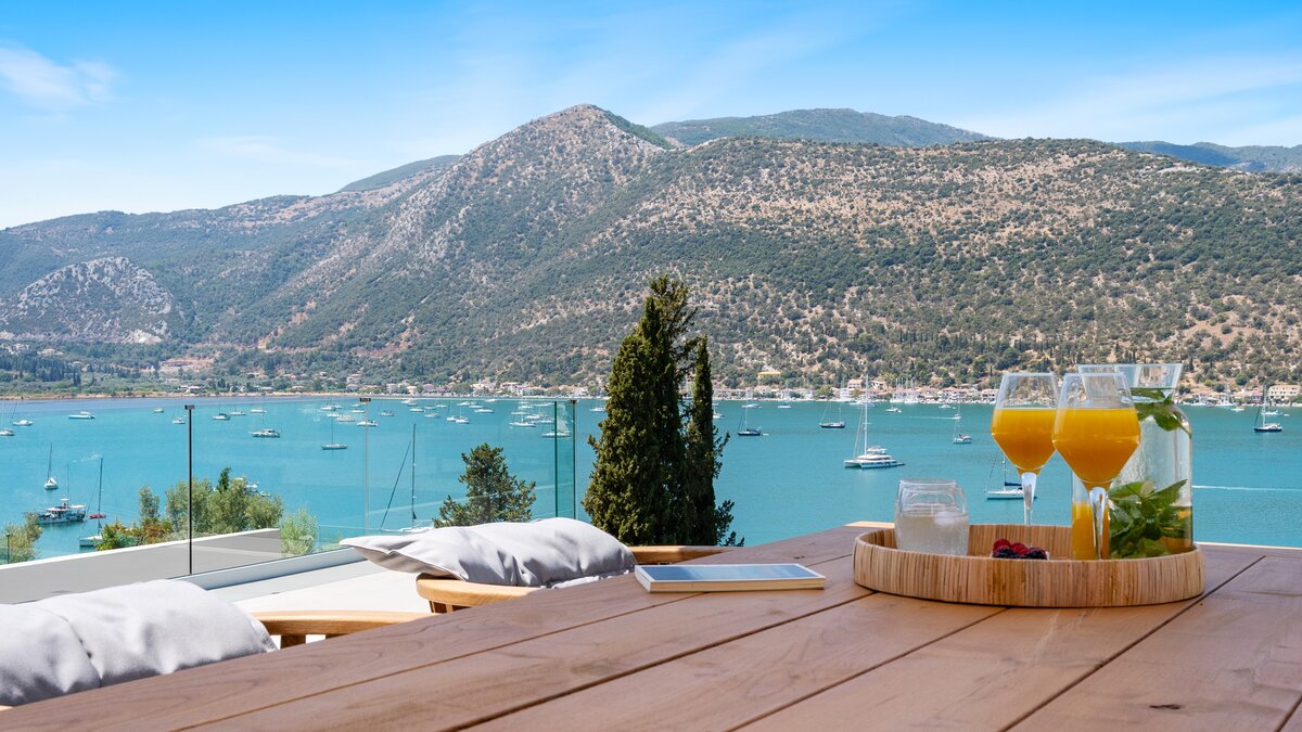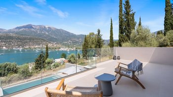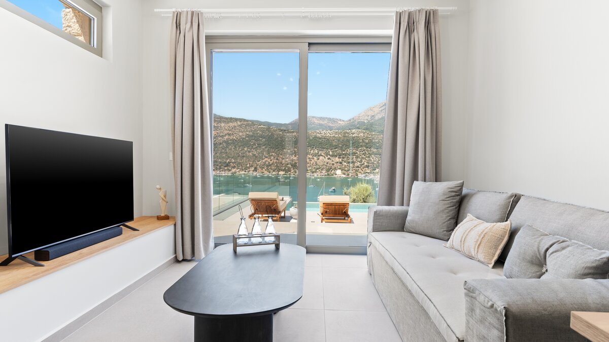 Die Innenräume der Villa zeugen von durchdachtem Design, bei dem jedes Element sorgfältig ausgewählt wurde, um das Gästeerlebnis zu verbessern. Elegante, moderne Möbel ergänzen den Panoramablick und schaffen Wohnräume, die sowohl intim und auch weitläufig sind. Deren voll ausgestattete Küche steht bereit für kulinarische Abenteuer, während die Hausbar den perfekten Rahmen für abendliche Cocktails bietet. Beiden Schlafzimmer bieten eine einzigartige Perspektive auf die atemberaubende Landschaft von Lefkada, mit Blick auf das Wasser und die dahinter liegenden Berge.