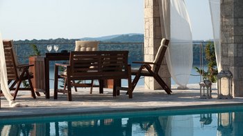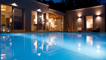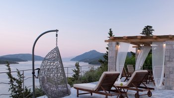 Eine kleine, aber fein geformte Villa in einer reizvollen Umgebung mit Blick auf die Inseln Skorpios und Sparti und in der Nähe eines bezaubernden Kieselstrandes.