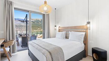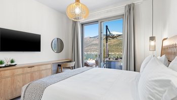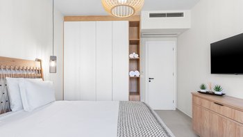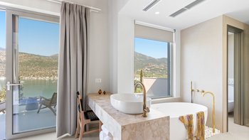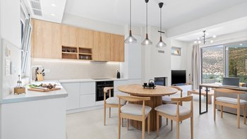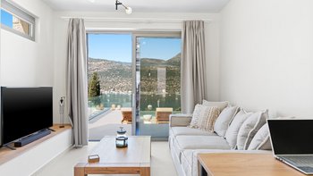 Die Innenräume der Villa Olea sind mit modernen Designelementen ausgestattet und verbinden ästhetische Exzellenz mit Funktionalität. Jeder Raum wurde sorgfältig gestaltet, um den natürlichen Lichtfluss von Raum zu Raum zu maximieren, wobei Meer- und Bergblick zur mühelos eleganten Atmosphäre beitragen. Deren voll ausgestattete Küche ermöglicht hausgemachte Mahlzeiten, während das Heimkino und die Bar den perfekten Ausgleich für Abendunterhaltung bieten. Beiden Schlafzimmer sind als persönliche Zufluchtsorte konzipiert, von denen jedes eine einzigartige Perspektive auf die atemberaubende Landschaft von Lefkada bietet und die Größe einer solch beruhigenden Umgebung unterstreicht.