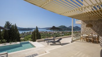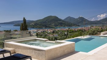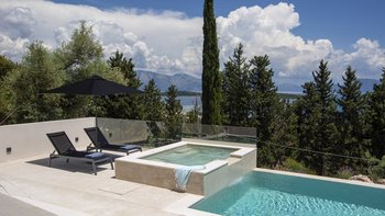 Draußen können Sie sich entspannen und die Aussicht vom Infinity-Pool mit Jacuzzi auf die berühmten Inseln Skorpios und Sparti genießen. Deren Villa ist nur zwei Minuten Fahrt von Nidri entfernt, mit seinen fabelhaften Restaurants, Einkaufsmöglichkeiten und Bootsverleih und zehn Minuten zu Fuß. Für die besondere Note kann ein Kochservice gegen Aufpreis hinzugefügt werden.