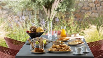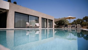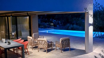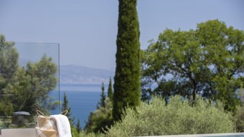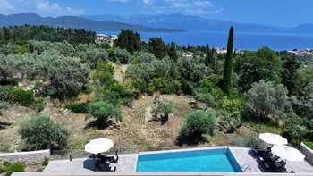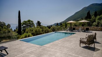 Der Außenbereich ist wirklich das Herzstück der Villa Dahlia. Im Mittelpunkt steht der große Infinity-Pool, umgeben von verschiedenen Entspannungsplätzen mit Liegestühlen und bequemen Sesseln. Ein Essbereich im Freien bietet den perfekten Rahmen für unvergessliche Mahlzeiten mit atemberaubender Aussicht. Von diesem Aussichtspunkt aus können die Gäste die Ostseite der Insel, das weite Ionische Meer, die Akarnanische Küste und die majestätischen Berge von Epirus bewundern. Deren Lage der Villa zwischen Oliven-, Mandel- und Zypressenbäumen, mit aromatischen Kräutern und Blumen, die die Dächer und Blumenbeete schmücken, schafft ein sensorisches Erlebnis, das die Gäste mit der natürlichen Schönheit der Insel verbindet.