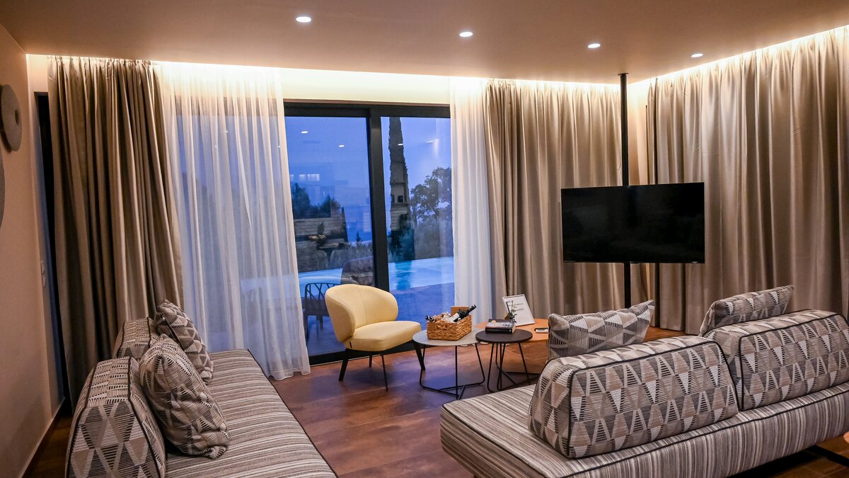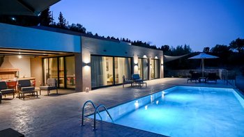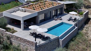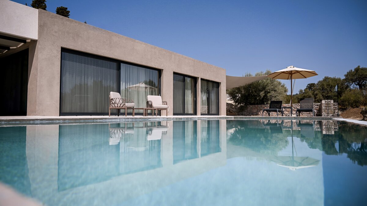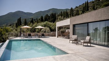 Die Villa Dahlia ist eine moderne Villa mit zwei Schlafzimmern in Lefkada, Griechenland, mit einem eleganten, stilvollen Interieur und einem entspannenden Infinity-Poolbereich, umgeben von einem Meer aus natürlichem Grünes.