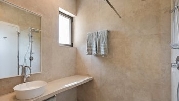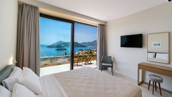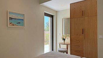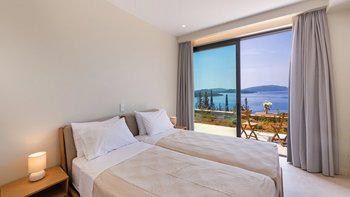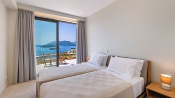 Jedes der fünf Schlafzimmer der Villa Odessa im unteren Erdgeschoss verfügt über ein eigenes Bad mit ebenerdiger Dusche, Zugang zur Terrasse über die Balkontüren und wurde elegant mit massiven Eichenholzmöbeln und natürlichen Stoffen eingerichtet. Der OFFENER GRUNDRISS Wohn- und Küchenbereich im Erdgeschoss öffnet sich auf die Terrasse, wo Sie sowohl Mahlzeiten im Freien genießen und auch entspannen können, bevor Sie die atemberaubende Aussicht genießen, die Lefkada zu bieten hat.