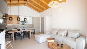 Vor der Tür steht der Privater Pool der Villa im Mittelpunkt; ein ruhiger Ort für ein morgendliches Bad oder lange Nachmittage unter der griechischen Sonne. Dessen großzügige Veranda und der umliegende Garten laden zum Essen im Freien oder einfach zum Entspannen in der sanften Meeresbrise ein. Wenn der Abend hereinbricht, färbt der ionische Sonnenuntergang den Horizont in goldenen und rosafarbenen Farbtönen; die perfekte Kulisse für ein unvergessliches Barbecue mit der Familie oder Freunden.