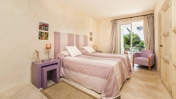 Mit Blick auf eine geschützte Bucht an der Südostküste der Insel, liegt Ca’n Mondrago inmitten von Rasengärten, die von viel Grünem abgeschirmt und durch den Schatten der Bäume gekühlt werden. Mit klimatisierten Innenräumen, wunderschön eingerichteten „Räumen“ im Freien und viel Platz in beiden verwischt die sehr schicke Villa die Grenzen von Innen- und Außenkomfort. Auf der oberen (Eingangs-)Ebene öffnet sich eine gut ausgestattete Küche zum Grundstück, wo es eine Palmengarten-Ess-/Sundowner-Terrasse gibt. Ein offen geschnittenes Wohn- / Esszimmer hat Türen zu einem überdachten Sitz- und Essbereich mit freiem Meerblick; und es gibt ein Hauptschlafzimmer und ein Zweibettschlafzimmer. All dies spiegelt sich im unteren Erdgeschoss wider, mit einem geräumigen Fernsehraum und zwei Zweibettzimmern, die sich jeweils zum Pool hin öffnen, einem weiteren Zweibettzimmer an der Seite des Hauses, einer Innenküche und einem Wechsel- und sowie einem und Chill-out-Bereich im Freien mit tief gepolsterten Sitzgelegenheiten.