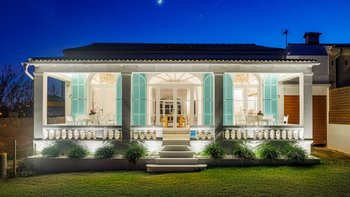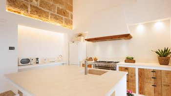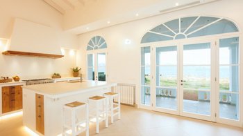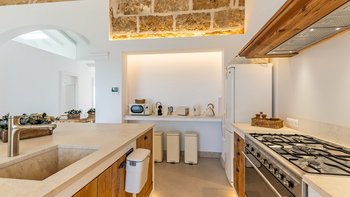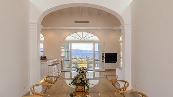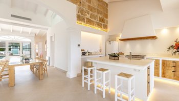 Im Inneren ist der großzügige Speisesaal ideal für Familienmahlzeiten und bietet ausreichend Platz für alle. Wie das Wohnzimmer verfügen beide Räume über französische Türen, die sich direkt in den Außenbereich öffnen. Deren moderne Küche ist mit modernen Geräten ausgestattet und verfügt über eine Mittelinsel, die als zusätzlicher Bereich für das Essen oder die Zubereitung von Speisen dient.