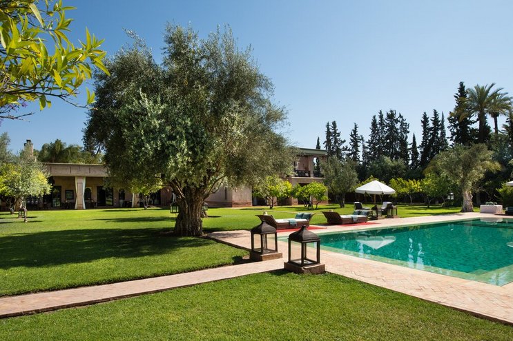 Dar Jannah ist eine luxuriöse Villa mit fünf Schlafzimmern inmitten eines drei Hektar großen Landschaftsgärten in Marrakesch, Marokko, mit einer Krocket-Wiese und einem Acryl-Tennisplatz.