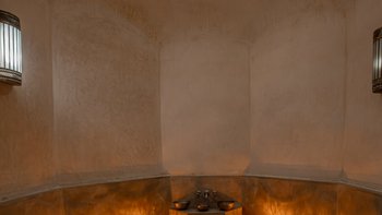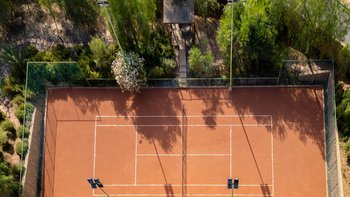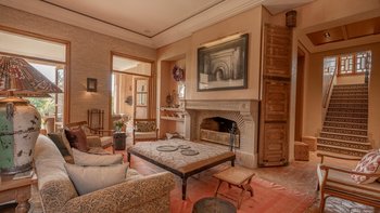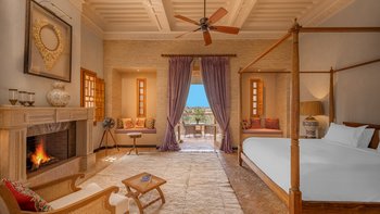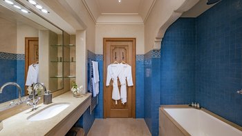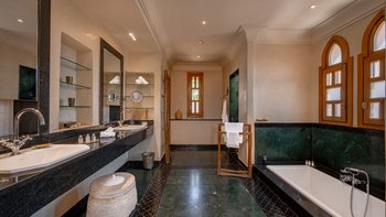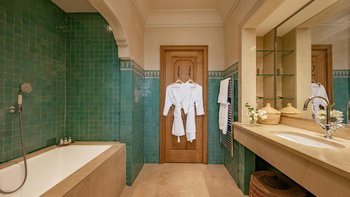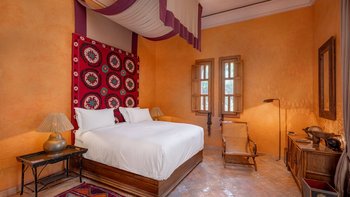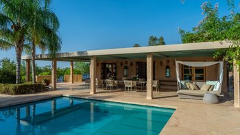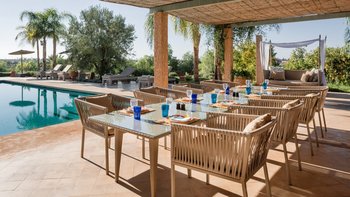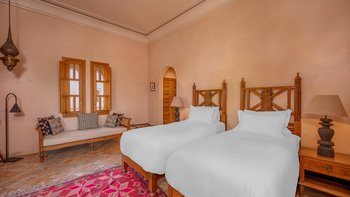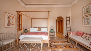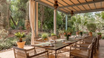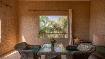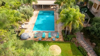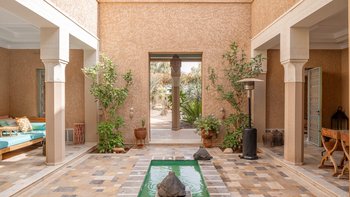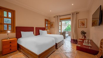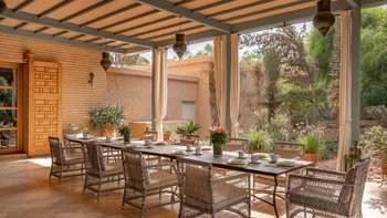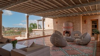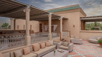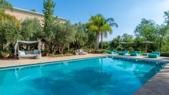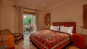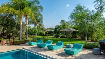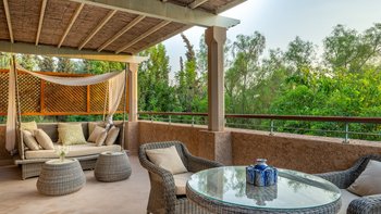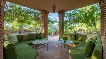 Die große, teilweise überdachte Terrasse, die die beiden Hälften des ersten Stocks verbindet, verfügt über einen Kamin und ist ideal für einen Sundowner mit Panoramablick auf den Sonnenuntergang über dem Atlasgebirge. Im Gästehaus gibt es ein weiteres Doppel- und Zweibettschlafzimmer, die etwas kleiner sind und zu einer Gemeinschaftsterrasse führen. Wenn man von der Terrasse in die weitläufigen Gärten spaziert, findet man den großen Privater Pool und die Terrasse mit bequemen Liegen und Sofas, das Poolhaus mit Küchenzeile, Hamam, Fitnessraum sowie einen Sandtennisplatz, Krocket- und Bouleplatz. Eine ultra-entspannende Atmosphäre wird durch Frühstück, Housekeeping-Service und Concierge-Service verstärkt, und die Köche bereiten das Mittag- und Abendessen zu. Mit einem sehr hohen Maß an Komfort und Service und einem guten Preis-Leistungs-Verhältnis ist dies eine sehr gute Option für Freunde oder Familien, die zusammen reisen.