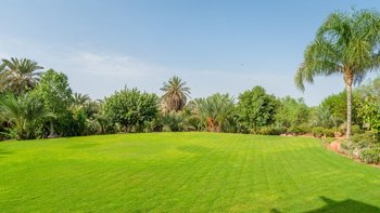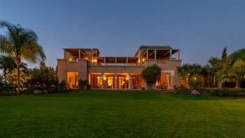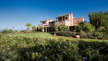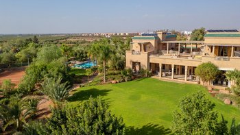 Wunderschöne, voll ausgestattete Villa mit großem Pool, Tennisplatz, Hamam und Yoga-Raum inmitten von Rasengärten. Angrenzend an den Golfplatz Assoufid und in der Nähe des lebhaften Marrakesch.