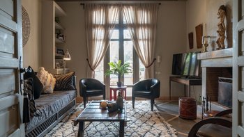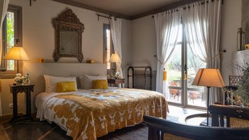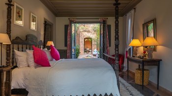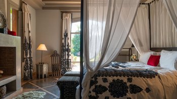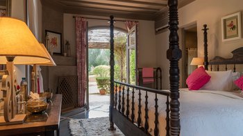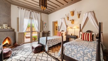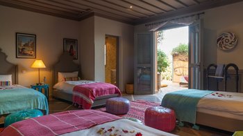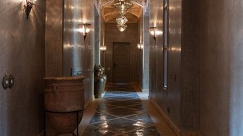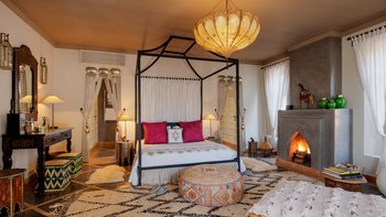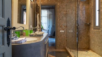 Das Innere der Villa ist makellos gepflegt, groß und geräumig, geschmackvoll in einer kühnen marokkanischen Farbpalette mit üppigen Textilien und komplizierten handgefertigten Lichtelementen eingerichtet. Ein helles und luftiges Wohnzimmer ermöglicht es den Gästen, sich bequem zu entspannen, Schach zu spielen oder im Freien zu speisen – mit Türen, die auf die Terrasse führen; Ein Fernsehraum fungiert auch als Bibliothek, mit der Möglichkeit eines Einzelbetts, das für ein Kind genutzt werden kann. Sechs beeindruckende Schlafzimmer und fünf fabelhafte traditionelle Bäder split befinden sich auf zwei Etagen, wobei die Master-Suite im ersten Stock einen Zugang zu einer privaten Terrasse und dem Dach bietet.