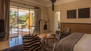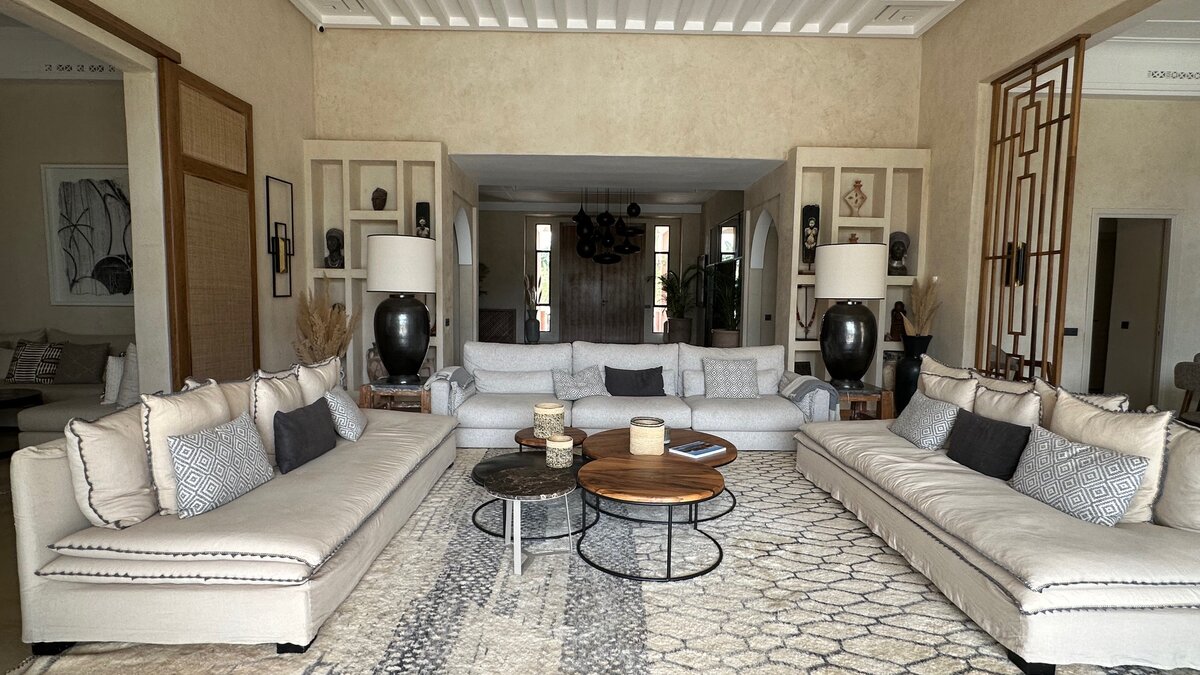 Im Inneren des Haupthauses befindet sich ein luftiger, offener Wohn- und Essbereich mit TV-Bereich, der auf die Terrasse hinausreicht; ein weiterer Fernsehraum bietet einen gemütlichen Ort für Filmabende. Deren Hauptsuite verfügt über ein Badezimmer en suite; ein weiteres Doppelzimmer verfügt über ein elegantes Duschbad en suite und drei weitere Schlafzimmer en-suite runden die Unterkunft ab. Ein besonderes Highlight ist die Gastronomie: Dessen hauseigenes Team kreiert individuelle Menüs, die duftende marokkanische Aromen mit europäischen Favoriten vermischen, oft mit Produkten aus dem großzügigen Gemüsegarten.