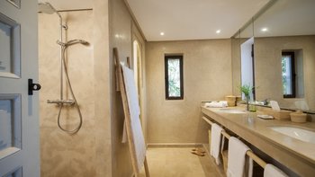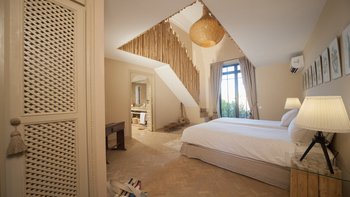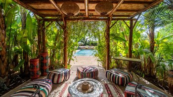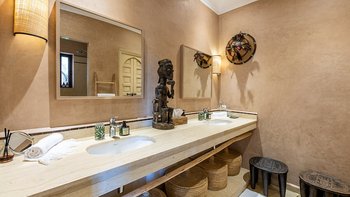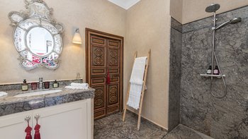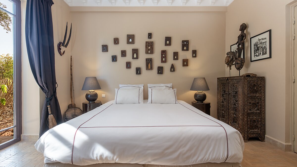 Die moderne, individuell eingerichtete Inneneinrichtung kontrastiert perfekt mit klassischen marokkanischen Akzenten. Mit kühlen Neutralen, frischen Weißtönen und eleganten Armaturen ist diese Villa reich an modernen Einrichtungen mit vielen einzigartigen Dekorationsstücken und Kunstwerken von den Reisen des jungen Eigentümers aus der ganzen Welt eingerichtet. Der moderne, offene Wohn- und Essbereich mit hohen Decken verbindet sich mit der großen Küche, die sich zur Terrasse im Freien öffnet. Der Koch serviert mit Unterstützung des Teams der Villa täglich Frühstück, Mittag- und Abendessen und.