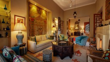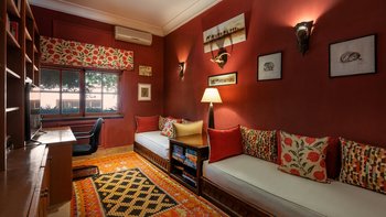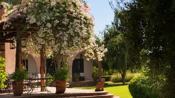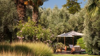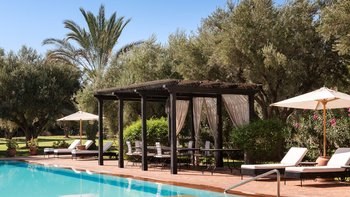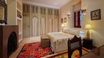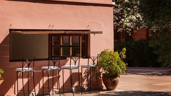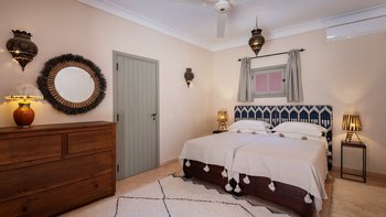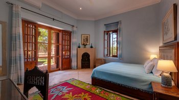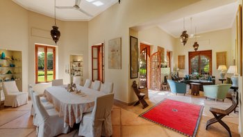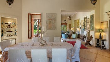 Innerhalb des Haupthauses gibt es eine große Eingangshalle, die zum Speisesaal führt, der Platz für bis zu 14 Gäste bietet. Der Salon verfügt über ein Holzfeuer, das an Wintertagen und -abenden bei Bedarf angezündet wird. Der Salon verfügt über ägyptische Wandbehänge aus den 1930er Jahren und antike Textilien, die von der Familie gesammelt wurden, fügen sich wunderbar mit eingelegten syrischen Spiegeln und Möbeln aus Perlmutt zusammen. Französische Türen führen auf die Terrasse mit einem Sitzbereich und einer mit Bougainvillea überdachten Pergola, die einem der Esstische Schatten spendet.
