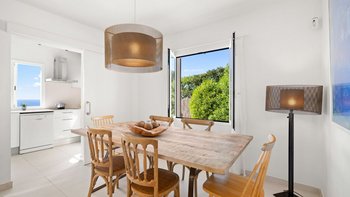 Im Inneren finden die Gäste einen geräumigen, lichtdurchfluteten Wohnbereich mit einer klaren, modernen Ästhetik. Der OFFENER GRUNDRISS verbindet sich nahtlos mit einer voll ausgestatteten Küche und schafft so einen praktischen und einladenden Raum für das tägliche Leben. Große Fenster rahmen den malerischen Meerblick ein und bringen die natürliche Schönheit Menorcas in das Herz des Hauses. Dieser Wohn- und Essbereich bietet einen komfortablen Rahmen, um sich zu entspannen und Zeit mit der Familie oder Freunden zu verbringen.