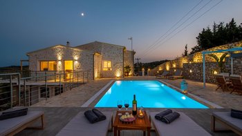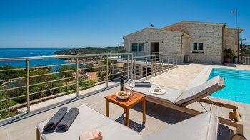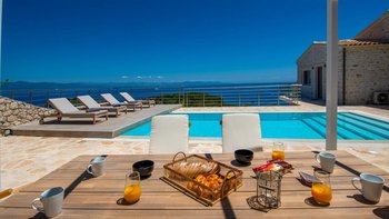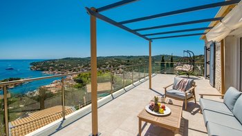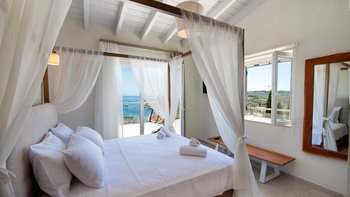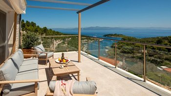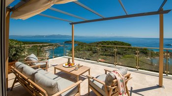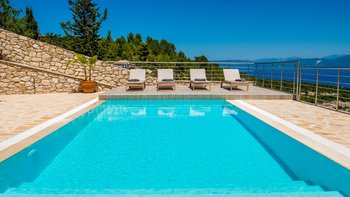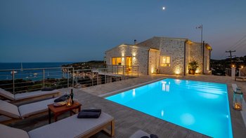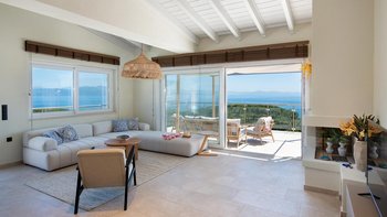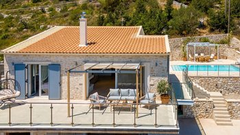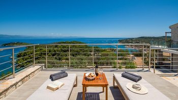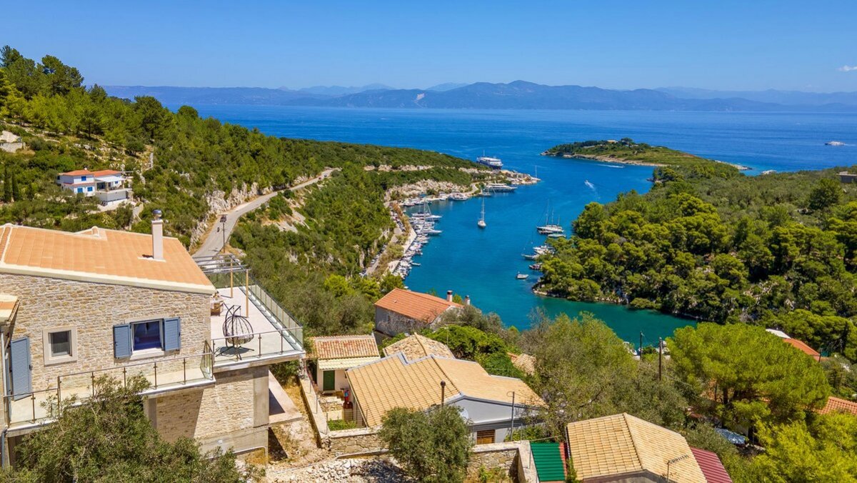 Eine charmante Villa mit zwei Schlafzimmern in Paxos, Griechenland, bietet die Villa Alexa einen weitreichenden Panoramablick von einer einzigartigen Hanglage aus, mit Blick auf die nahe gelegene Hafenstadt Gaios und die Gewässer dahinter.
