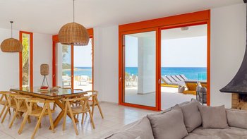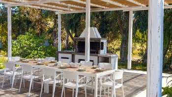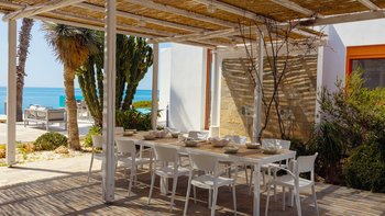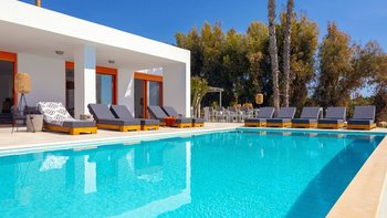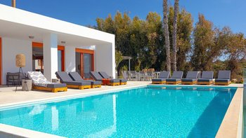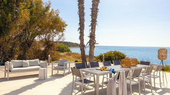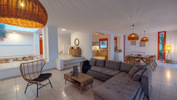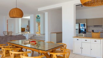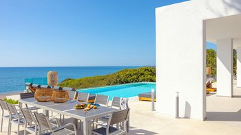 Im Außenbereich befindet sich ein großer PRIVATER POOL, der den Mittelpunkt der Terrasse bildet. Der weitläufige Außenbereich ist ideal für große Gruppen und Großfamilien, um lange, gemütliche Mittagessen zu genießen. Nur wenige Schritte entfernt befindet sich ein Privatstrand mit goldenem Sand und kristallklarem Wasser, der für einen wirklich ruhigen Inselurlaub sorgt.