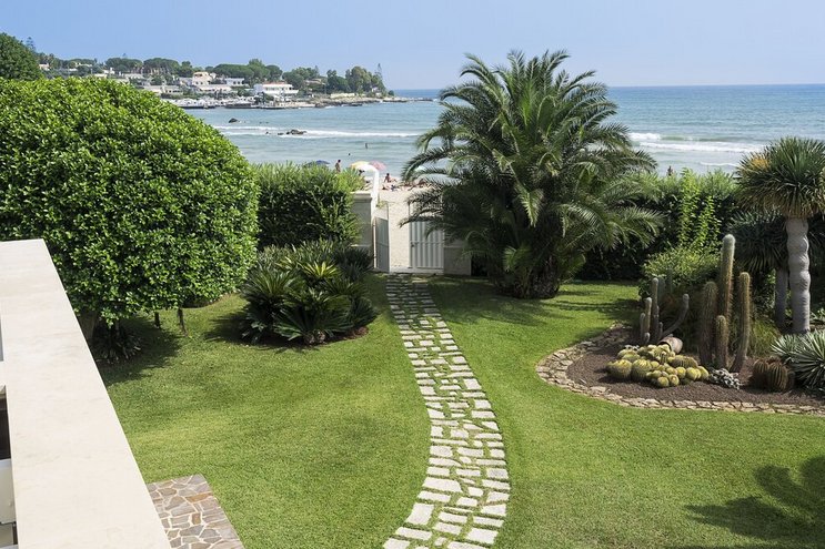 Inmitten von Gärten mit Rasen und direktem Zugang zum Meer erwartet Sie diese moderne Villa in der Nähe eines Sandstrandes und Restaurants in Modica und Scicli.