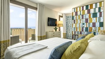Im Obergeschoss befinden sich weitere drei Doppelschlafzimmer. Zwei Kingsize-Doppelzimmer mit einem gemeinsamen Bad und ein Hauptschlafzimmer mit Bad en suite. Aller Schlafzimmer haben Zugang zum Balkon, wo Sie bequeme Sitzgelegenheiten und Meerblick genießen können.