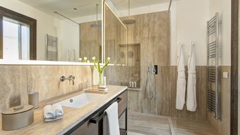 Wenn die Gäste über die große und moderne Treppe betreten, werden sie von der makellos gestalteten Eingangshalle begrüßt. Weiters geht es mit der OFFENER GRUNDRISS Küche, dem Ess- und Wohnbereich. Dieser Raum wurde geschmackvoll eingerichtet, von den weichen Möbeln bis hin zu den interessanten Kunstwerken. Es ist auch hell und luftig, dank der vielen französischen Türen, die auf die Terrasse und den Poolbereich führen. Ein Schlafzimmer befindet sich im Erdgeschoss; ein Kingsize-Doppelzimmer mit Dusche en suite und eigenem Zugang zur Außenwelt.