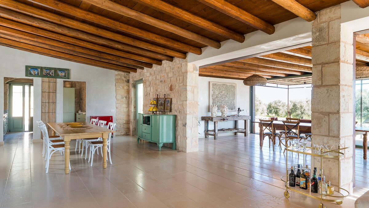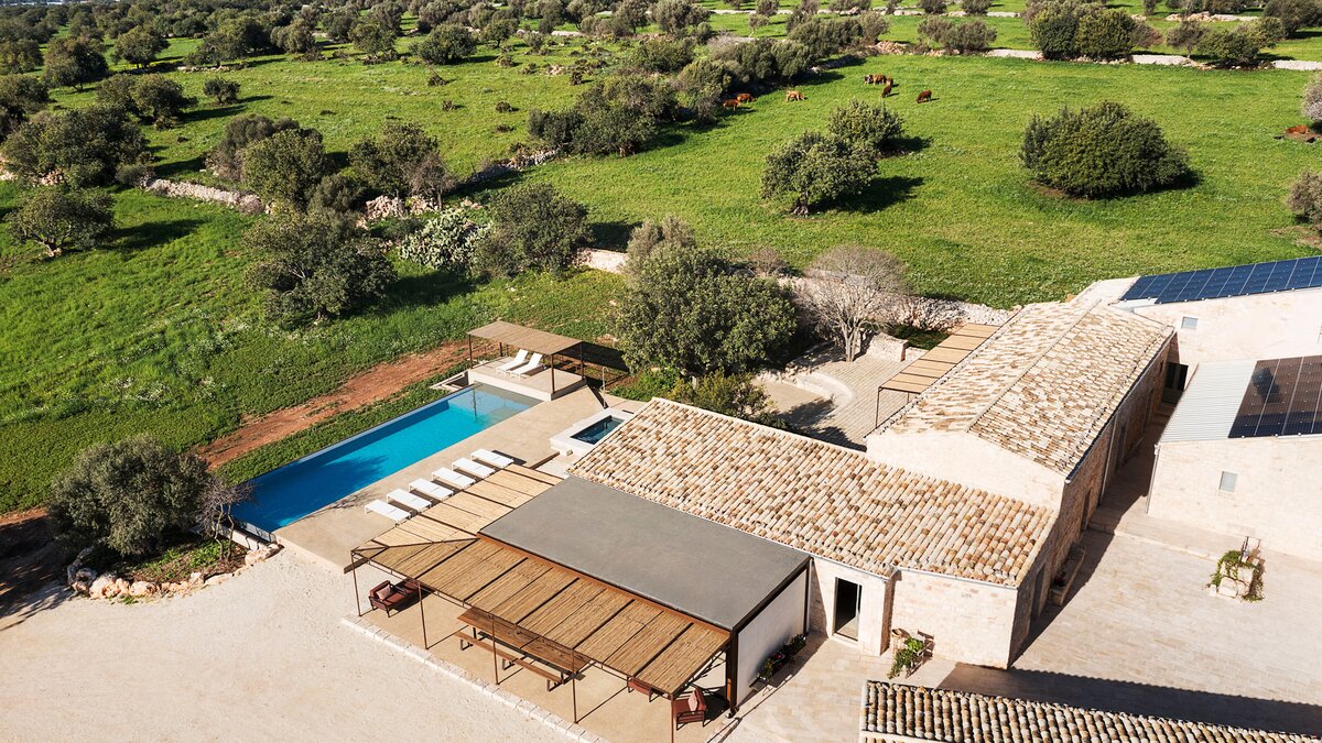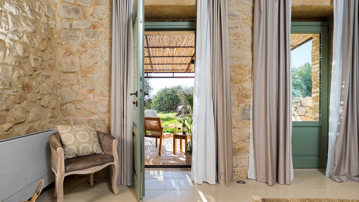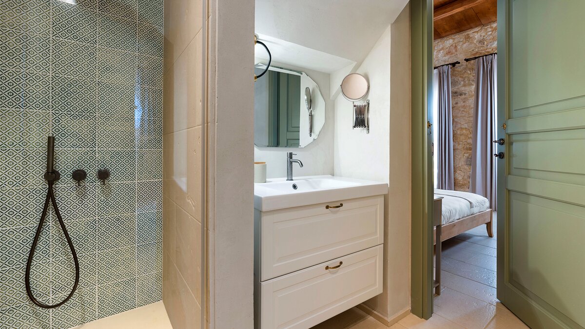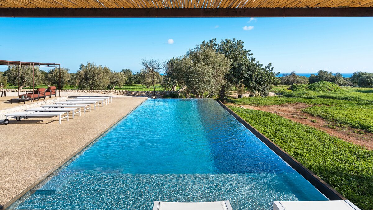 Draußen ist die Umgebung genauso besonders. Schattige Terrassen erstrecken sich entlang des Hauses und eignen sich perfekt für ein langsames, sonnenverwöhntes Mittag- oder Abendessen unter dem Sternenhimmel. Der Salzwasser-Pool glitzert in der Sonne, Liegestühle warten in der Nähe und ein Whirlpool befindet sich direkt daneben, um sich verwöhnen zu lassen. Dessen Landschaft erstreckt sich über sanfte Falten von Olivenbäumen und weite Ausblicke auf das Meer und schafft eine Kulisse natürlicher Schönheit und Ruhe.