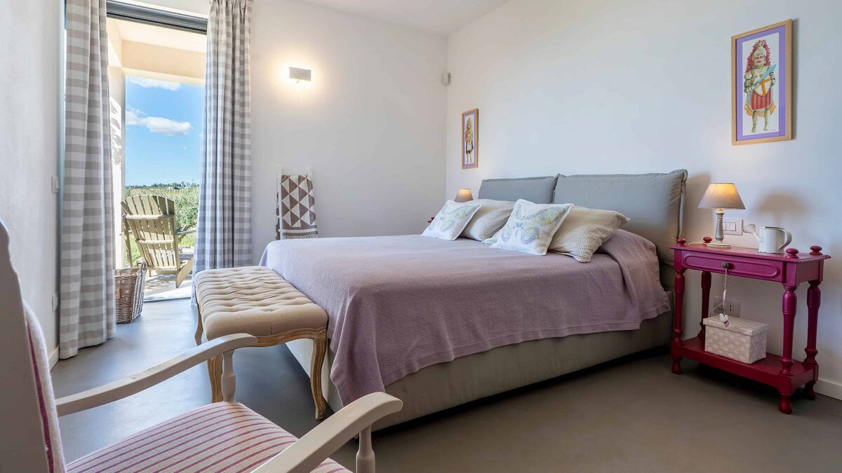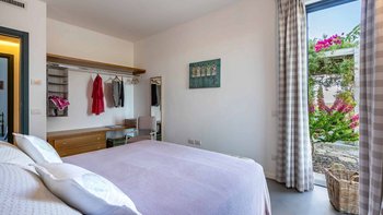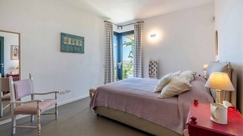 • Schlafzimmer mit Doppelbett (Kingsize-Bett) mit Zugang zur Poolterrasse