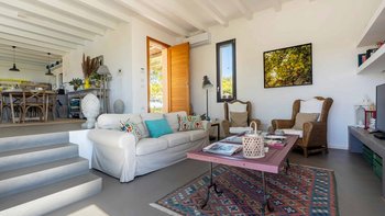 Die Villa ist auf einer Ebene gestaltet und öffnet sich in einen hellen und einladenden offenen Wohnbereich mit einem gemütlichen Wohnzimmer mit Sofas und Sesseln, die um einen modernen Kamin angeordnet sind. Ein paar Stufen führen hinauf zum stilvollen Essbereich und der gut ausgestatteten Küche, die wunderschön von einer eleganten zentralen Halbinsel mit Induktionskochfeld definiert wird, wo polierte Betonböden, freiliegende Balkendecken und weitläufige Glastüren ein lichtdurchflutetes und geräumiges Ambiente schaffen, während sie nahtlosen Zugang zur Hauptterrasse und einen weiten Blick über die Landschaft bieten. Ein Flur führt zu den ruhigen Schlafbereichen, die drei gut ausgestattete Schlafzimmer umfassen: ein Haupt-Doppelzimmer mit eigenem Duschbad und direktem Zugang zur Poolterrasse, ein zweites Schlafzimmer mit herrlichem Blick und Türen, die zur Hauptterrasse und zum Poolbereich führen, und ein flexibles Doppel- oder Zweibettzimmer mit Zugang zu einer ruhigeren, schattigen Terrasse, was die Villa ideal für Familien oder kleine Gruppen von Freunden macht.