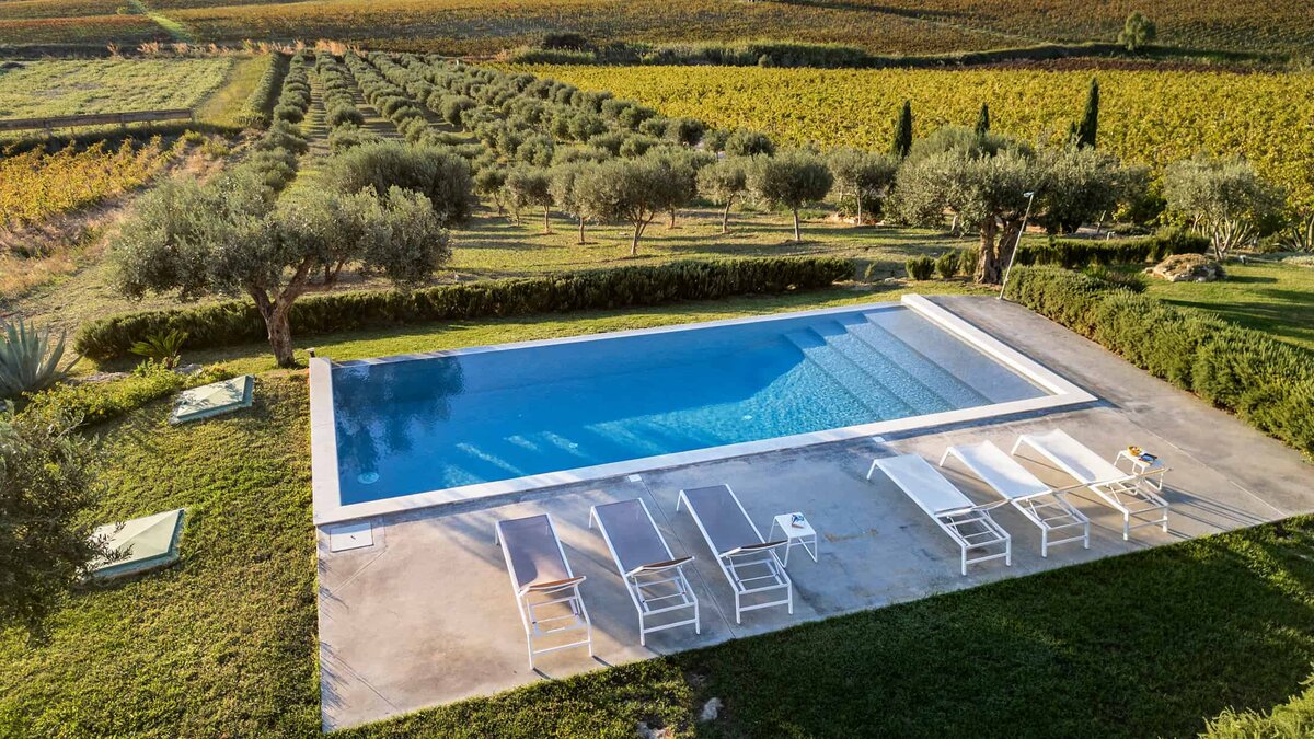 Umgeben von langen Reihen von Weinbergen und Olivenbäumen genießt die Villa La Solette eine unverwechselbare Lage in der Landschaft von Menfi und bietet eine raffinierte Mischung aus modernem Komfort und klassischem mediterranem Stil.
