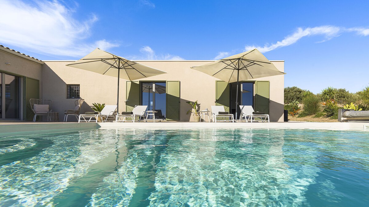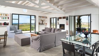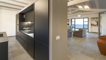 Im Inneren werden die Gäste von einem offenen Grundriss Wohn- und Essbereich begrüßt. Dieser Zimmer ist hochwertig eingerichtet, bietet viel natürliches Licht und verfügt über eine Handvoll Fenstertüren, die für einen nahtlosen Innen- und Außenlebensstil mit Panoramablick auf das Meer und das Tal sorgen. Weiters gibt es eine elegante und geschmackvoll gestaltete Küche mit Frühstückstheke und drei modernen Schlafzimmern; ein Hauptschlafzimmer mit Dusche en suite, ein Doppel- und Zweibettschlafzimmer, die sich ein Duschbad teilen.