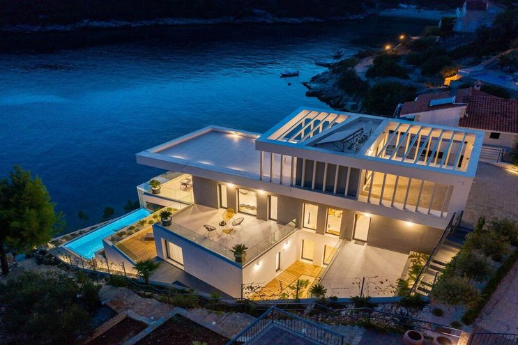 Die Villa Venus ist eine Meisterklasse in modernem Design und ist ein großzügiger Rückzugsort mit acht Schlafzimmern am Wasser in der Nähe von Split, Kroatien, mit zwei verschiedenen Poolbereichen, einem Home-Fitnessstudio und einer privaten Sauna.