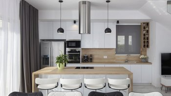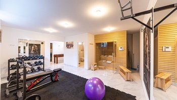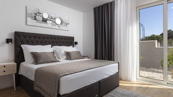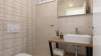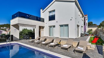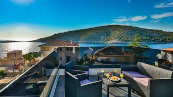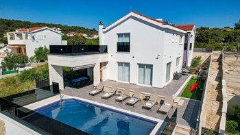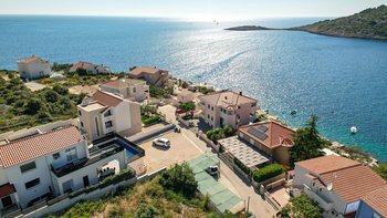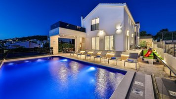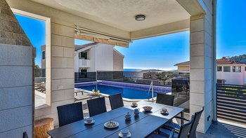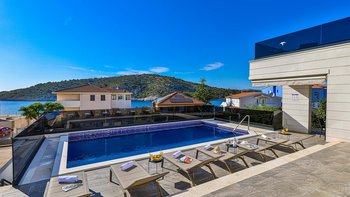 Diese moderne Familienvilla liegt perfekt in einer Bucht in der Nähe von Rogoznica und bietet einen luxuriösen Aufenthalt mit Meerblick, einer Sauna und einem Fitnessraum.