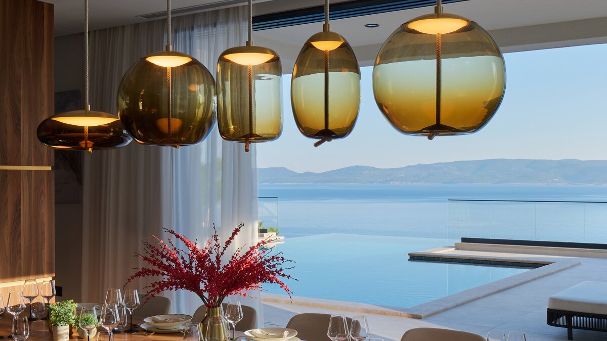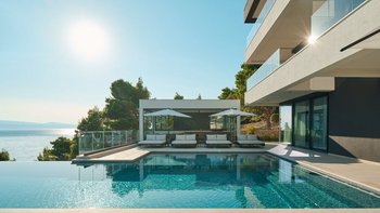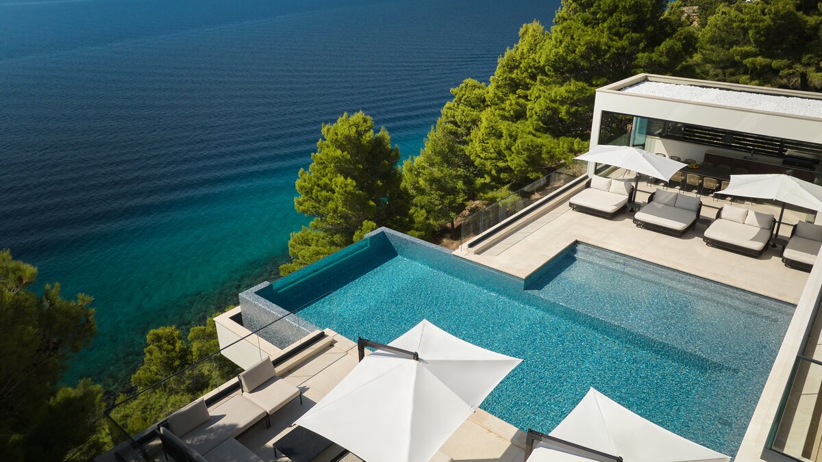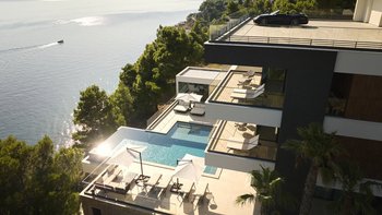 Die Villa Venus ist eine Meisterklasse in modernem Design und ist ein großzügiger Rückzugsort mit acht Schlafzimmern am Wasser in der Nähe von Split, Kroatien, mit zwei verschiedenen Poolbereichen, einem Home-Fitnessstudio und einer privaten Sauna.