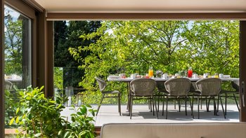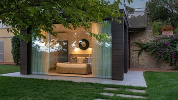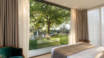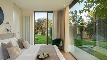 Im Inneren präsentieren die lichtdurchfluteten Innenräume moderne Kunstwerke und Panoramafenster, die die hügelige Landschaft umrahmen. Deren Erdgeschoss verfügt über eine stilvolle offene Küche und einen Essbereich, der nahtlos in ein Panorama-Wohnzimmer übergeht, in dem Sie sich nach einem erlebnisreichen Tag entspannen können. Eines geräumiges Schlafzimmer mit Doppelbett und eigenem Duschbad befindet sich auf der Hauptebene, während ein zweites Schlafzimmer mit Doppelbett über eine Treppe vom Panorama-Wohnzimmer aus zugänglich ist. Dieses Panorama-Schlafzimmer öffnet sich zum Garten. Zwei weitere geräumige Schlafzimmer, die sich ebenfalls zum Garten hin öffnen, sind über eine Innentreppe in der Nähe des Eingangs der Immobilie zu erreichen.