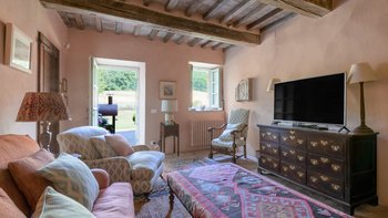 In den Hügeln zwischen Cortona und Mercatale gelegen, befindet sich dieses imposante alte Herrenhaus in ruhiger Abgeschiedenheit und ist dennoch gut gelegen, um sowohl toskanische und auch umbrische Städte zu erkunden. Dessen wunderschön restaurierten Dachsparren, Eichendecken und Steinstürze der Villa stehen heute neben modernen Geräten, modernem Komfort und faszinierenden Artefakten in mit schlichter Eleganz eingerichteten Zimmern. Im Herzen des Hauses befindet sich ein charmanter Salon in frischem Blau und Weißen, ergänzt durch einen gemütlichen Fernsehraum, ein Arbeitszimmer im ersten Stock und ein Wohnzimmer mit Galerie. Das Maniero di Sorbello besticht durch seine Innenausstattung mit Stoffen aus Chelsea Textiles, Percheron und Claremonte sowie Möbeln aus aller Welt. Es ist reich an Kultur, italienischen Elementen, einem gustavianischen Bücherregal aus dem 18. Jahrhundert und römischen Antiquitäten.