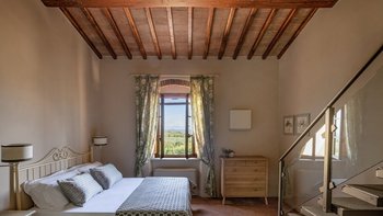 Der Zugang zur Villa Chiantisol erfolgt über eine auffällige Auffahrt, die von schönen Rosen gesäumt ist, während die umliegende Landschaft ein üppiges Meer aus grünen Hügeln und kaskadierenden Weinbergen ist. Der Wohnbereich im Freien ist ebenfalls ziemlich spektakulär, mit einem versunkenen nierenförmigen Pool und erhöhtem Außen-Jacuzzi gepaart mit Sonnenliegen und Sonnenschirmen sowie weiteren bequemen Sitzgelegenheiten, um im Freien zu entspannen und den ruhigen Panoramablick zu genießen. Deren Unterkunft erstreckt sich über drei geräumige Etagen, wobei im Erdgeschoss ein OFFENER GRUNDRISS Wohnbereich mit einer charmanten Küche im Landhausstil in warmen Terrakotta-Tönen eingerichtet ist, der Hauptwohn- und Essbereich mit einem Tisch, an dem alle Gäste gemeinsam speisen können, sowie eine separate Hauptküche. Ein Schlafzimmer mit Doppelbett und ein weiteres WC runden diese Etage ab.