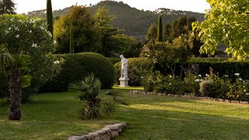 Im Außenbereich können die Gäste einen großen Pool, einen Tennisplatz, einen Gemüsegarten und einen großen Gartenpark von zwei Hektar mit eigenem See genießen. Es gibt auch eine schöne Auswahl an Sitzgelegenheiten im Freien zum Essen und Essen. Der Garten ist in mehrere Themenbereiche unterteilt, von denen jeder seinen eigenen Charakter hat. Der Pavillon ist ideal für Hochzeiten und andere besondere Feierlichkeiten. Ein Koch ist für eine Mahlzeit pro Tag inbegriffen und es gibt eine Auswahl an Restaurants, die zu Fuß erreichbar sind.