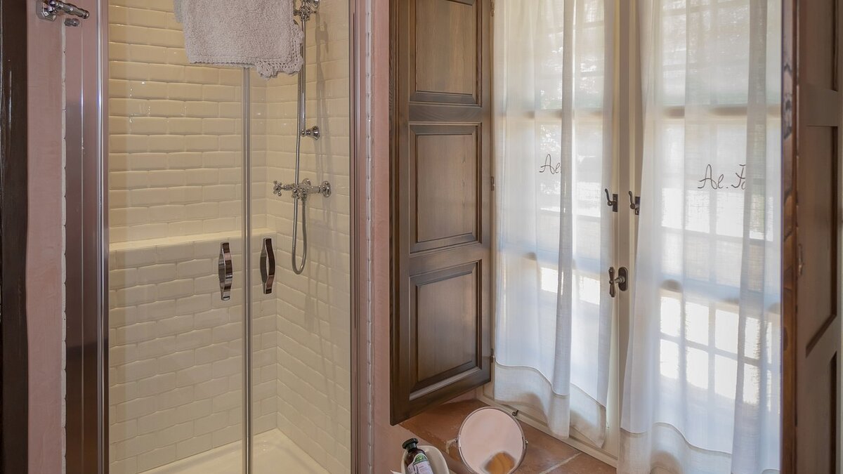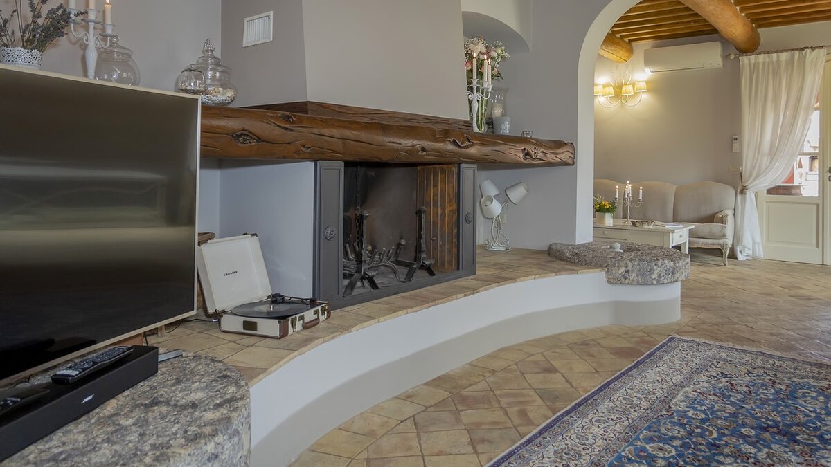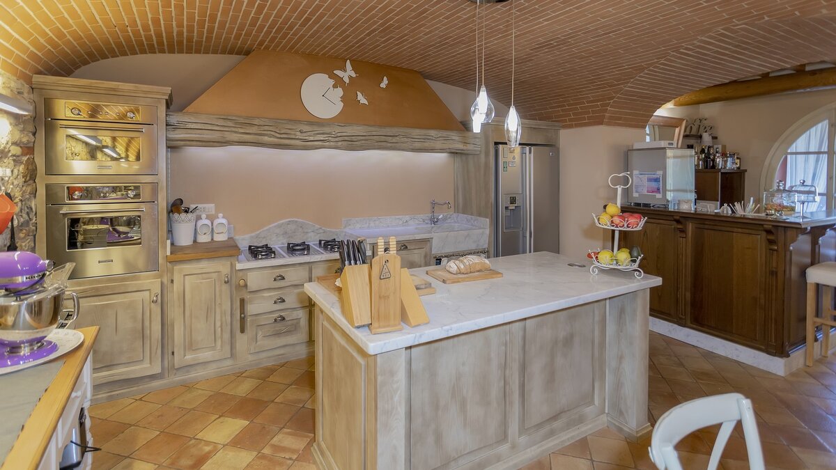 Durch die Eingangshalle können die Gäste die geräumige, OFFENER GRUNDRISS Küche, den Ess- und den Barbereich nutzen; der perfekte Ort für Geselligkeit. Mit unverputztem Backstein und klassisch im italienischen Stil gehaltenen Interieurs sorgt dieser Raum für eine warme Atmosphäre. Neben der Küche befindet sich eine kleine Kaffeebar, ein großartiger Ort für einen morgendlichen Cappuccino. Weiters gibt es ein Wohnzimmer mit Bibliothek, einen Arbeitsbereich und ein Schlafzimmer mit Doppelbett mit Holzbalken und Dusche en suite. Jedes Zimmer verfügt über geschmackvolles Interieur und direkten Zugang zum Außenbereich.