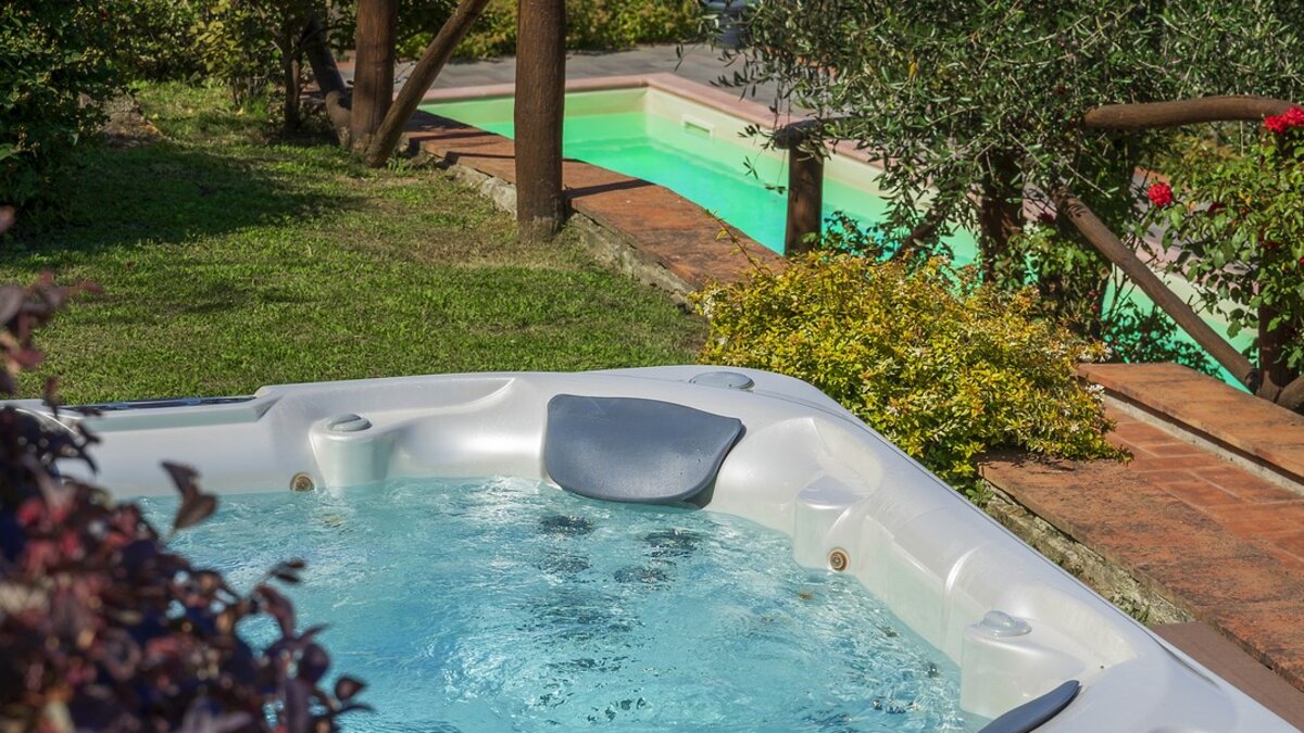 Draußen in den gepflegten Gärten gibt es einen bezaubernden Außenbereich mit Grill und Holzofen, einem großen Swimmingpool und Jacuzzi, die alle von Olivenhainen und Weinbergen umgeben sind.