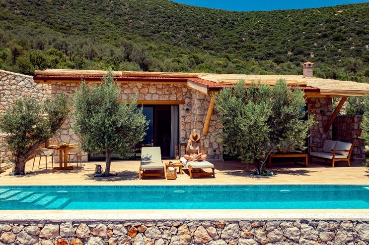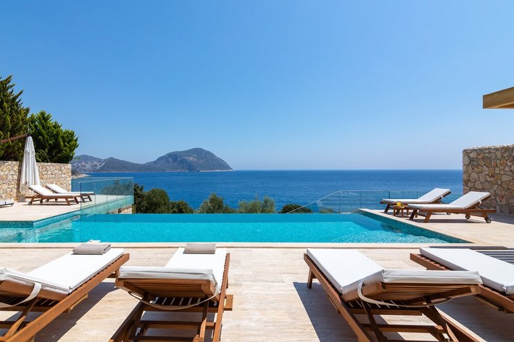 Villa Akim I ist stilvoll und anspruchsvoll mit einem Infinity-Pool und direktem Strandzugang – der perfekte Ort für Paare, die in Kalkan Urlaub machen.