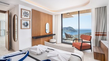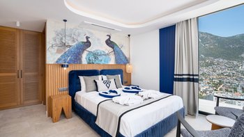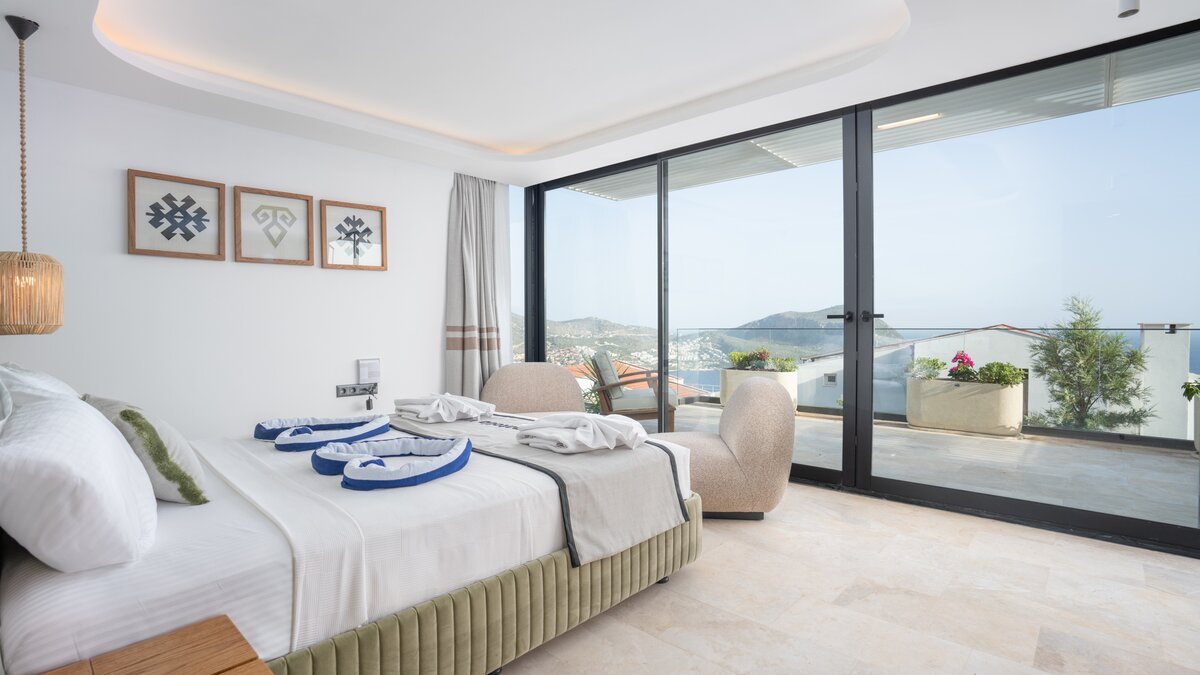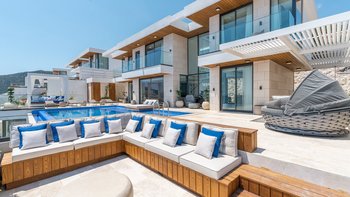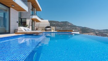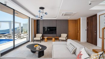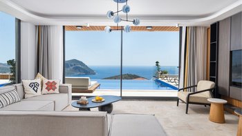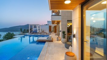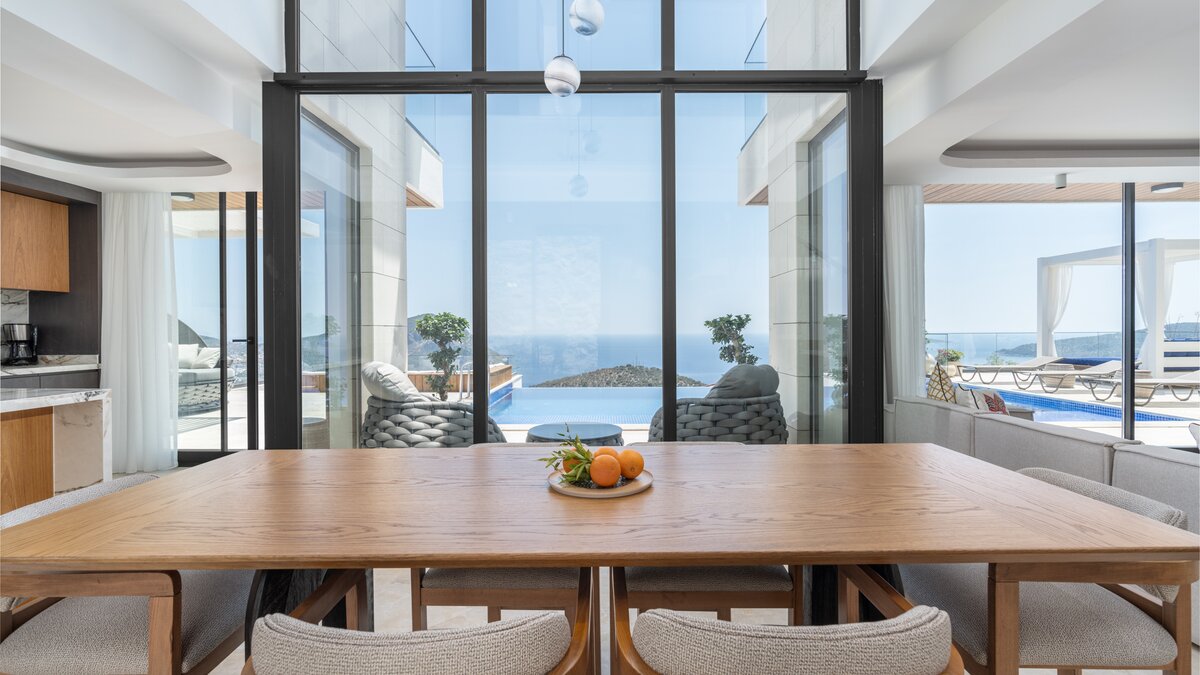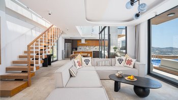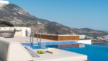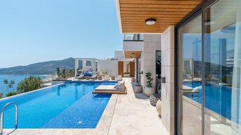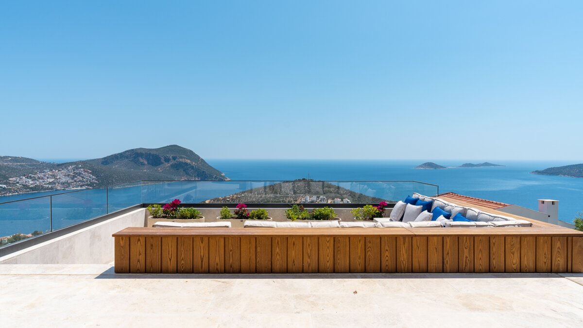 Im Außenbereich der Villa befindet sich eine weitläufige Poolterrasse mit übergroßen Liegen und gepolsterten Sitzbereichen, die den idealen Rahmen zum Faulenzen und Beisammensein bietet. Der 10-Meter-Infinity-Pool scheint mit dem Horizont zu verschmelzen und bietet eine erfrischende Pause von der türkischen Sonne. Ein einladender Grill- und Essbereich im Freien sorgt für unvergessliche Zusammenkünfte unter dem Sternenhimmel. Für diejenigen, die sich fit halten, erwartet Sie ein privates Fitnessstudio im unteren Stockwerk mit atemberaubendem Meerblick. Deren Villa befindet sich in der Kalamar-Bucht und bietet einfachen Zugang zum charmanten Stadtzentrum von Kalkan und den unberührten Stränden, so dass die Gäste das Gute der türkischen Riviera erkunden können.