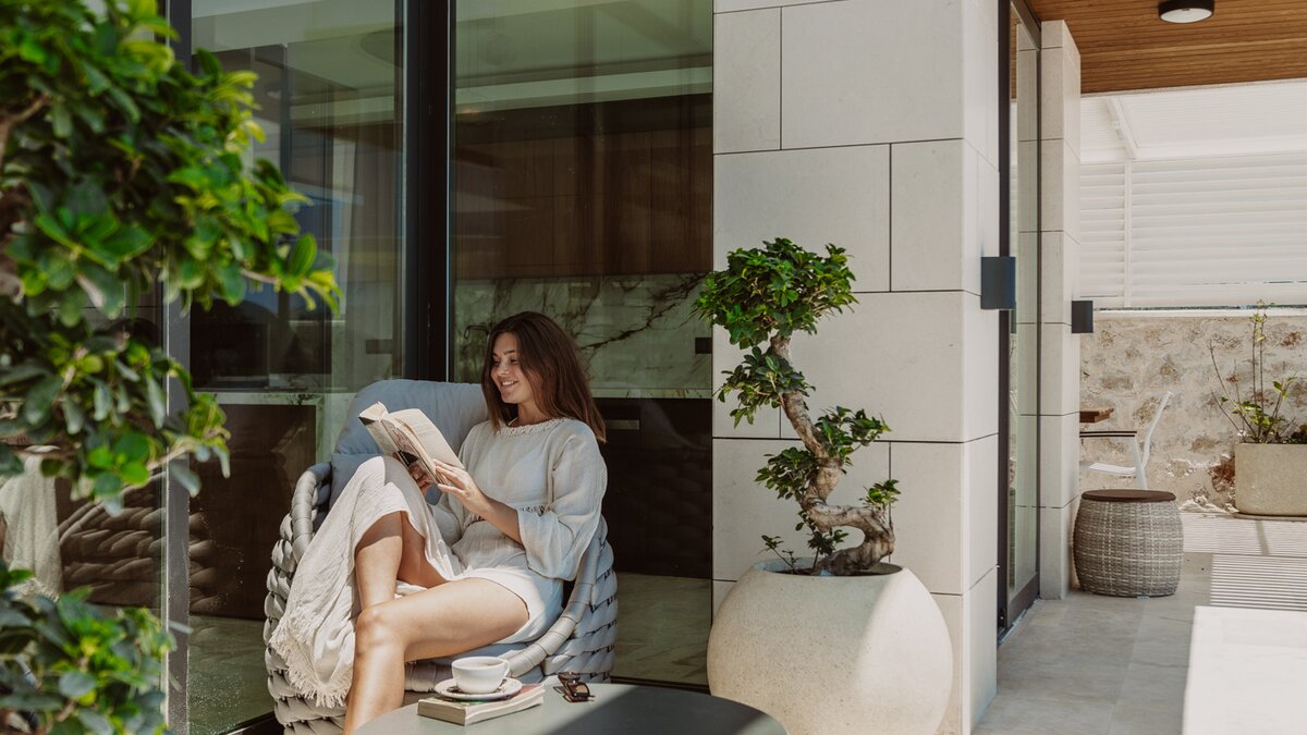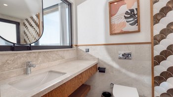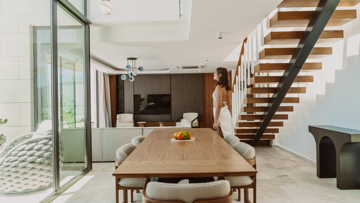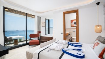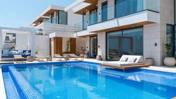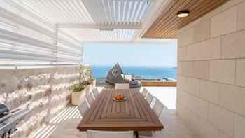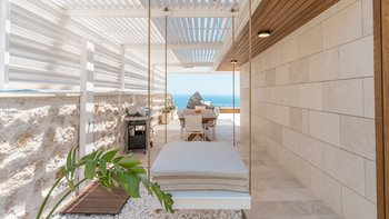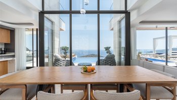 Das elegante Interieur der Villa umfasst einen offenen Wohnbereich im Erdgeschoss, der in natürliches Licht getaucht ist, mit Plüschmöbeln und einer Küche mit verschiedenen Holzelementen ausgestattet ist. Eine Galerie im Zwischengeschoss und eine große Glasverglasung verstärken die Wirkung des weitreichenden Blicks auf das Mittelmeer der Villa. Denen fünf Schlafzimmer mit eigenem Bad, die sich auf drei Etagen verteilen, bieten private Zufluchtsorte mit modernen Annehmlichkeiten. Deren Master-Suite im ersten Stock verfügt sogar über eine Indoor-Whirl-Badewanne, in der Sie sich nach einem Tag voller sonnenverwöhnter Abenteuer entspannen können.
